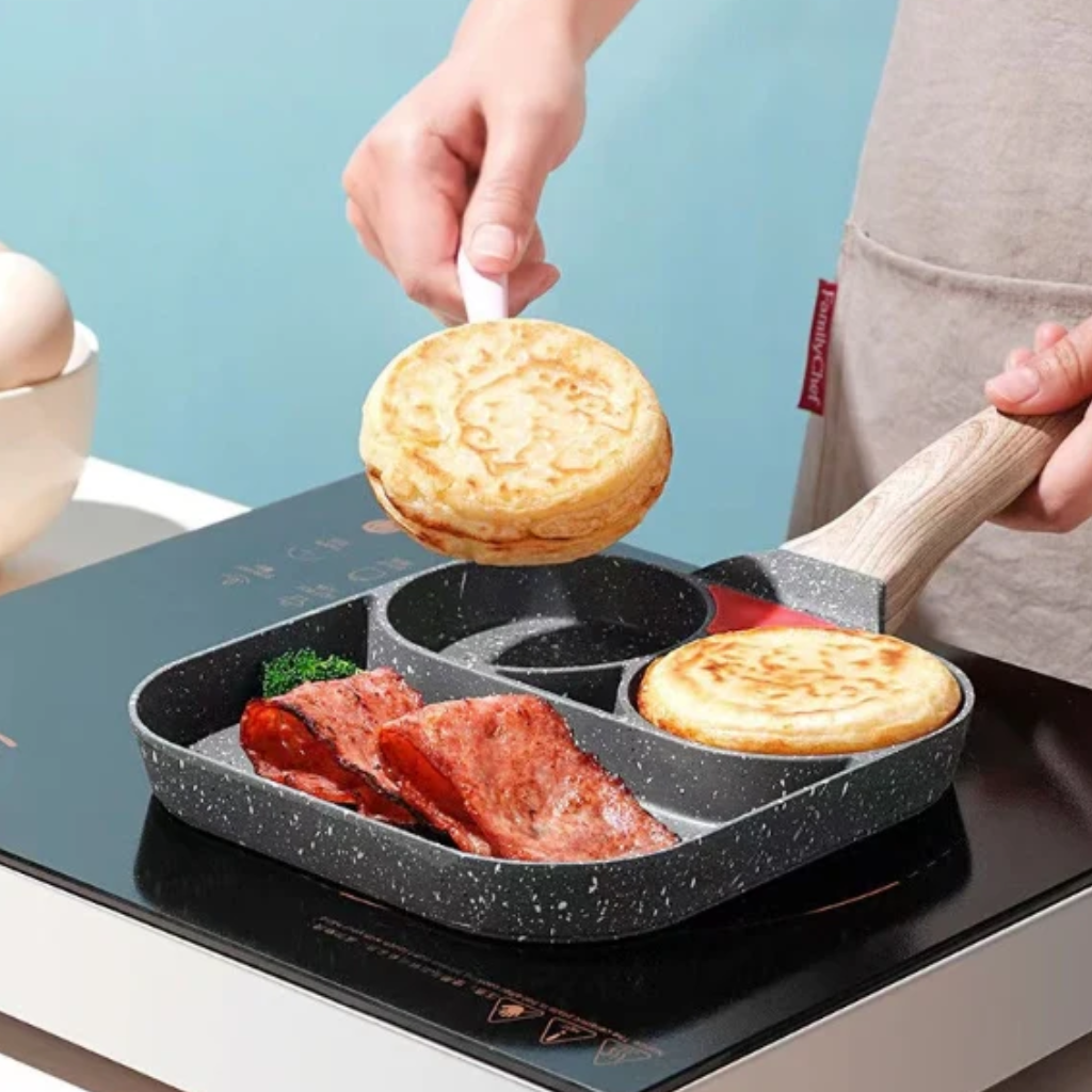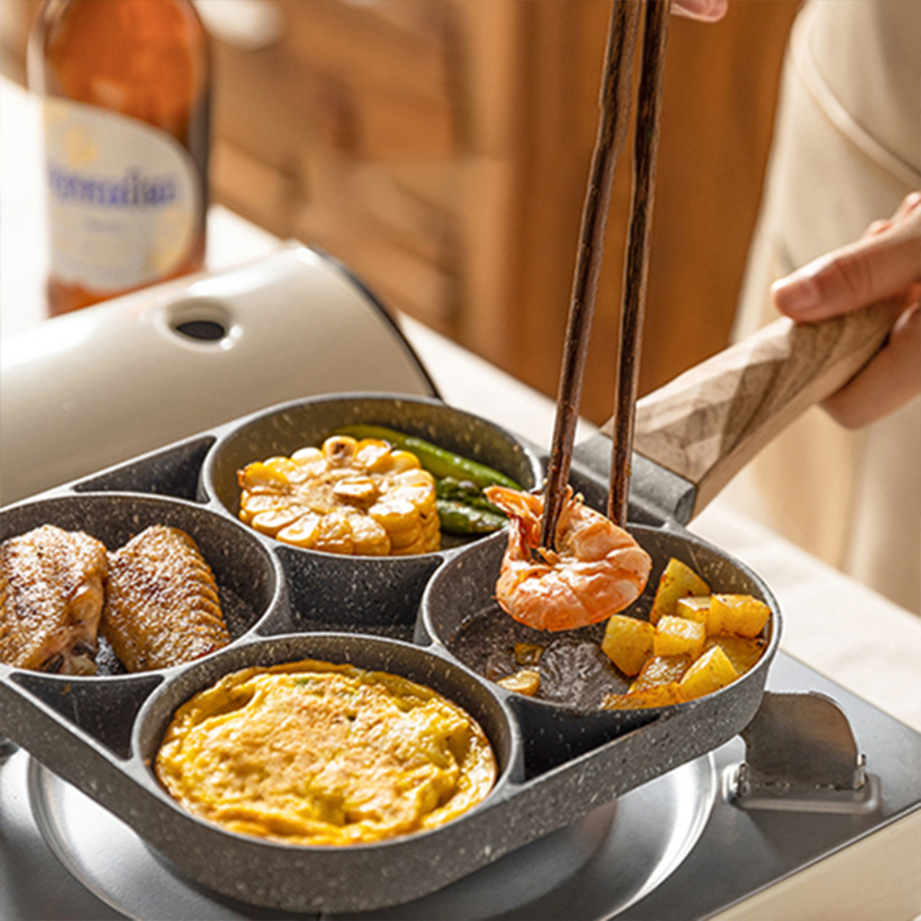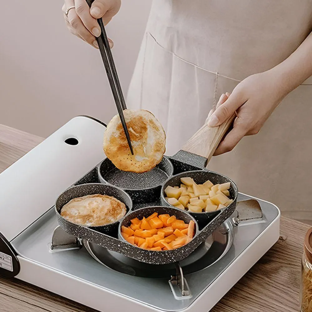 es perfecta para quienes buscan practicidad en la cocina. Con cuatro cavidades, permite freír huevos, preparar panqueques, mini hamburguesas y mucho más de forma rápida y uniforme. Fabricada con recubrimiento antiadherente de alta calidad, evita que los alimentos se peguen, reduciendo el uso de aceite y facilitando considerablemente la limpieza.